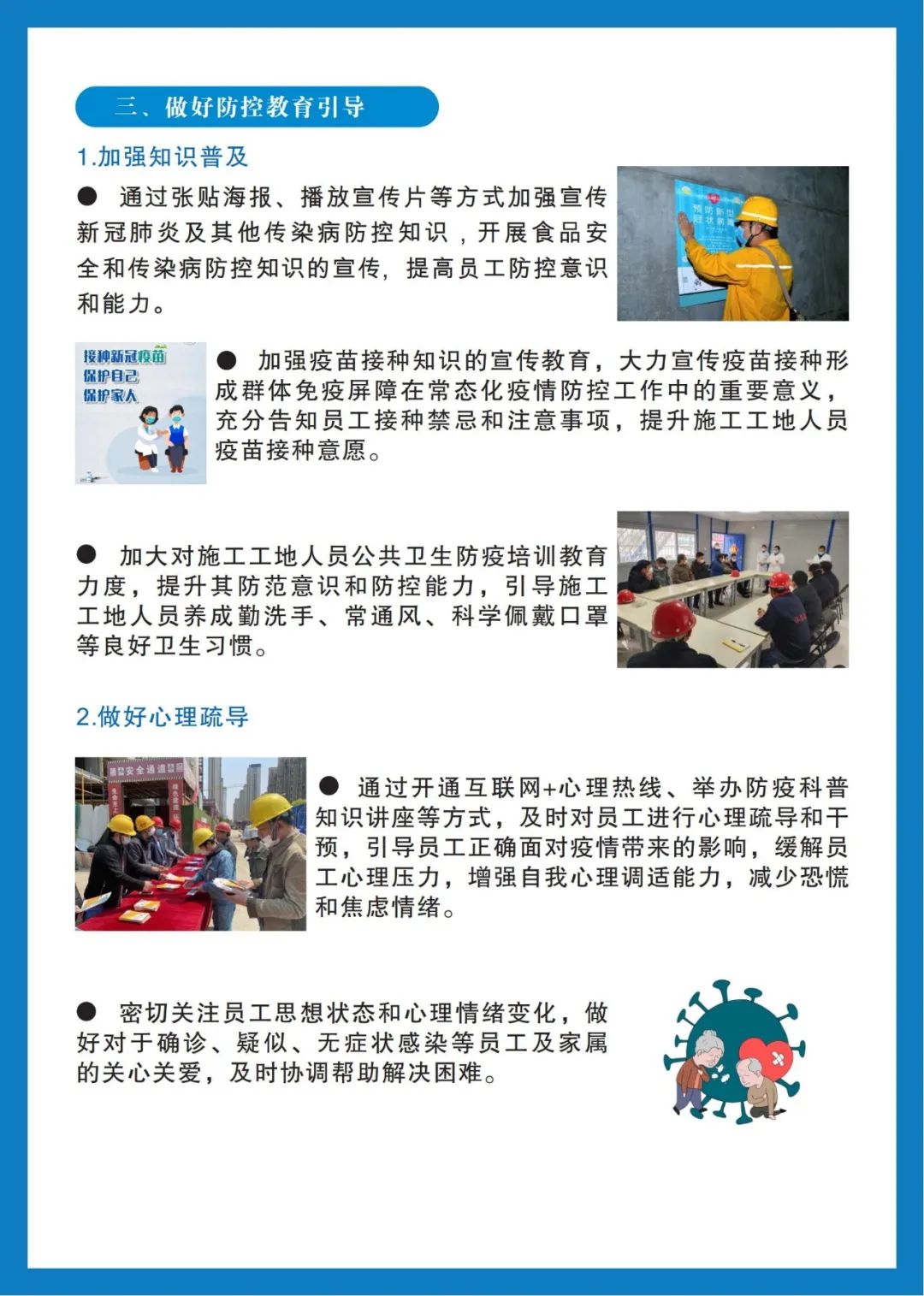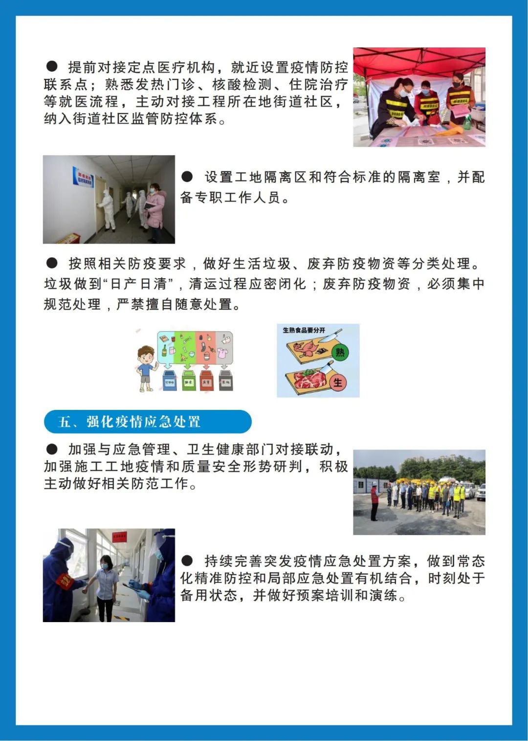 四、加强培训教育,做好疫情防控宣传。各地住房和城乡建设主管部门要督促工程项目参建单位按照疫情防控有关要求,加大对施工工地人员公共卫生防疫培训教育力度,提升其防范意识和防控能力,引导施工工地人员养成勤洗手、常通风、科学佩戴口罩等良好卫生习惯。要严格开展上岗前疫情防范措施交底,确保疫情防范各项要求落实到每一名员工、每一个岗位。参建单位要关注施工工地未接种疫苗人员,详查未接种原因,持续加强施工工地疫苗接种工作宣传力度和正向引导,提升施工工地人员疫苗接种意愿,确保施工工地人员“应接尽接,应接必接”。