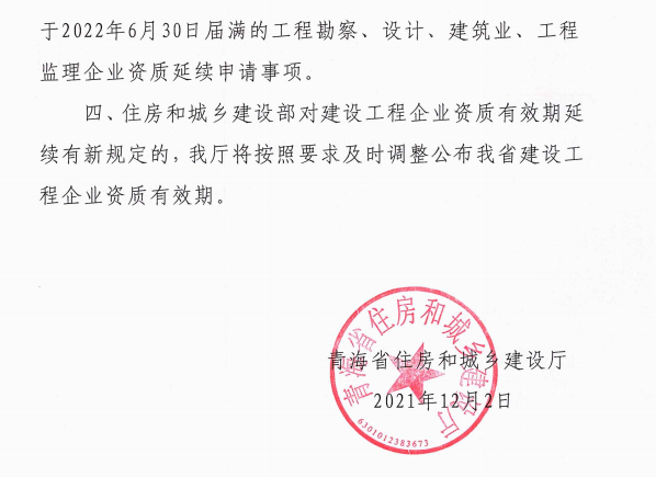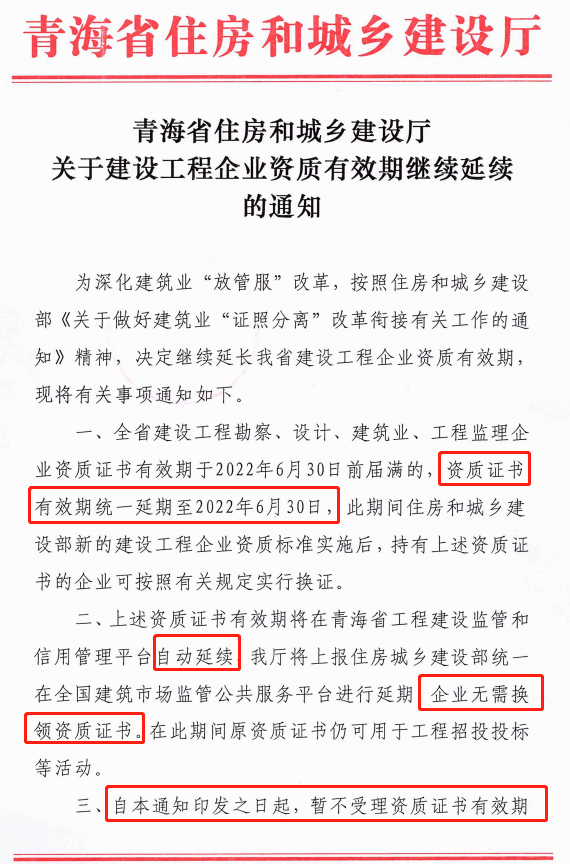 一、我省工程勘察、设计、建筑业、监理企业资质证书有效期于2021年12月31日至2022年6月29日期间届满的,资质证书有效期延期至2022年6月30日。