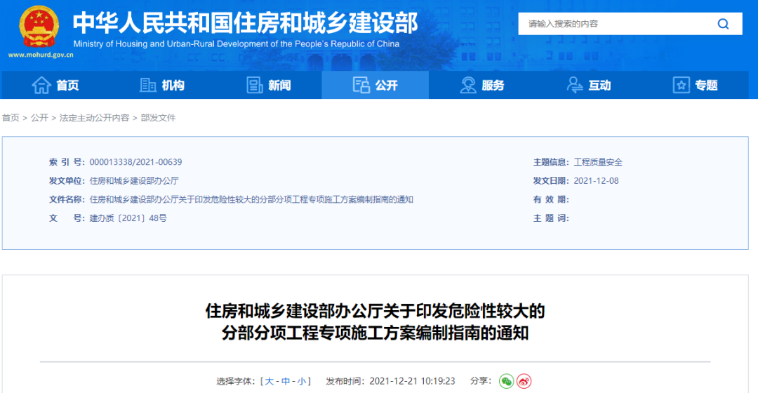 住建部官网正式发布危险性较大的分部分项工程专项施工方案编制指南