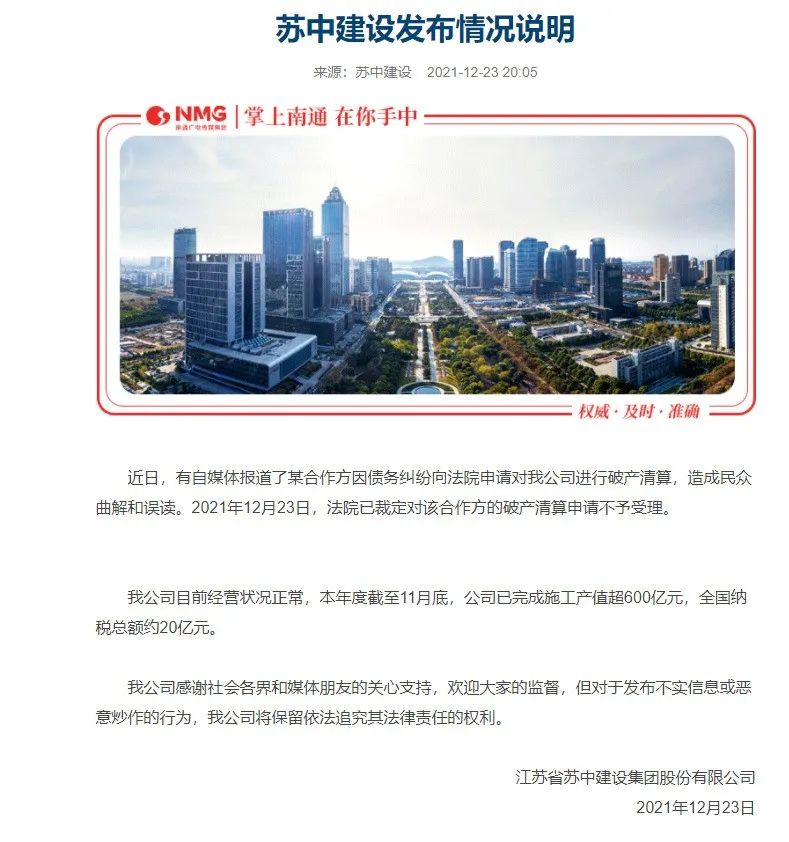 苏中建设随即发布情况说明:因债务纠纷,合作方向人民法院申请对我司进行破产清算,法院已裁定不予受理。