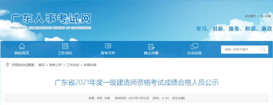 根据《人力资源社会保障部办公厅关于印发<专业技术人员职业资格考试考务工作规程>的通知》(人社厅发〔2021〕18号)、广东省人力资源和社会保障厅办公室《关于印发实行告知承诺制证明事项清单的通知》(粤人社办〔2021〕8号)及告知承诺制相关要求,现对广东省2021年度一级建造师资格考试成绩合格人员予以公示,共10654人(详见附件1)。