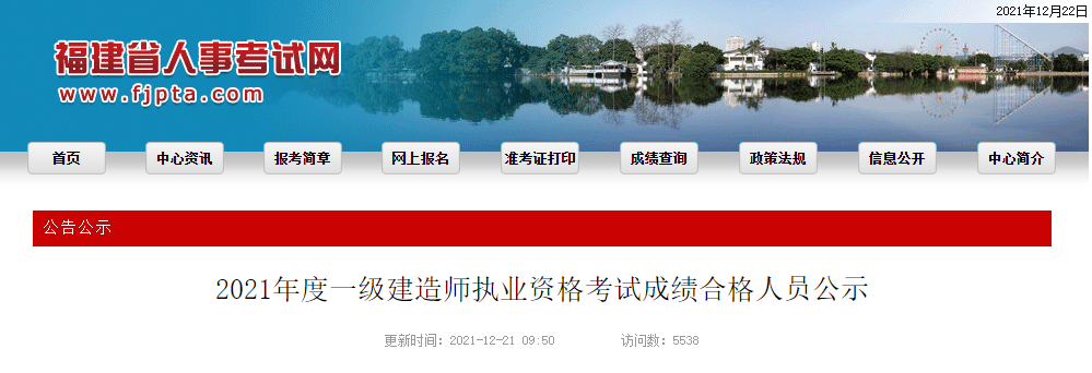 根据《司法部关于印发开展证明事项告知承诺制试点工作方案的通知》(司发通[2019]54号)、《专业技术人员职业资格考试报名证明事项告知承诺制工作规程》(人社厅发[2021] 1号)及人力资源社会保障部办公厅关于印发《专业技术人员职业资格考试考务工作规程》的通知(人社厅发〔2021〕18号)的规定和要求,现将福建省2021年度一级建造师执业资格考试成绩合格人员予以公示,共5323人(名单附后)。