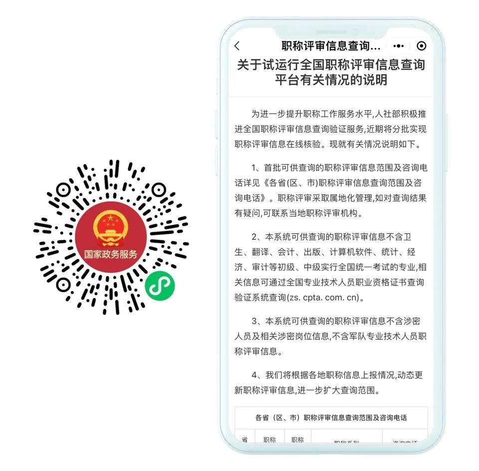 01:微信搜索“国家政务服务平台”,首页搜索“职称评审信息查询说明”或扫描下方葵花码进入服务,确认个人信息是否在可供查询的职称信息范围内。