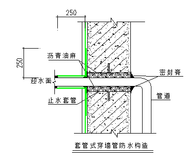 止水套管预埋——套管清理——安装管道——内侧用沥青油麻丝堵塞——外侧用沥青油麻丝堵塞——打密封膏——防水附加层——防水层