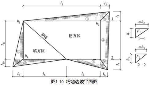 了保证挖方土壁和填方区的稳定和施工安全,场地挖方区和填方区的边沿都需要做成边坡,其平面图如图1-10所示。