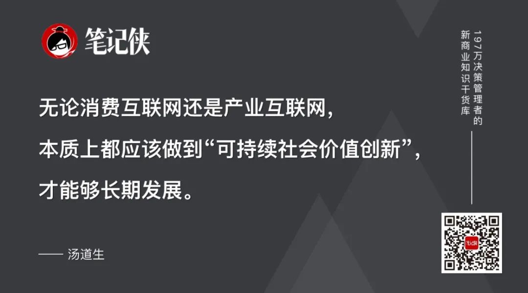 产业价值与社会价值也是统一的,无论消费互联网还是产业互联网,本质上都应该做到“可持续社会价值创新”,才能够长期发展。