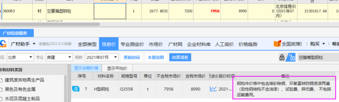 通过这两项内容分析,我们知道至少除锈、探伤我们就不能再套定额了。那么剩下我们还要看看空腹箱型柱的材料费里都含什么,这个一定取决于我们计入的材料价格。