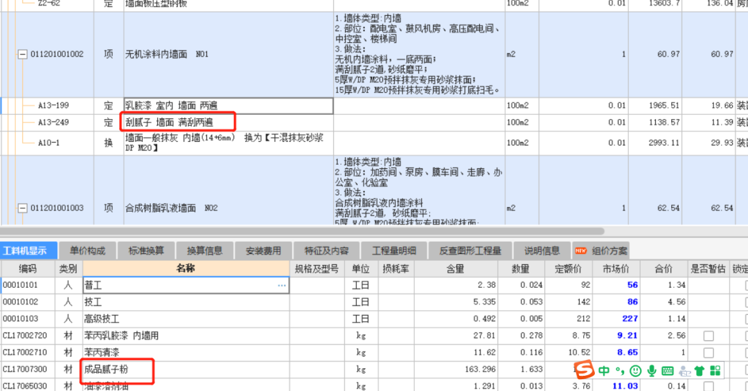 所有定额一起上,这个最常见的就是在装修工程的组价中,对装修工艺不了解,对定额工料机含量不了解,导致定额重复套取,综合单价偏高的情况。 首先,举一个装修里面经常犯错的地方:装修的面层涂料,我们在做的时候一看清单特征描述有满刮腻子,面层是乳胶漆,就不加思索地既套腻子的定额又套乳胶漆的子目。然而只要点开A13-199乳胶漆子目下的工料机组成我们就会发现,该子目内是带有腻子含量的,这就导致定额重复套取了。