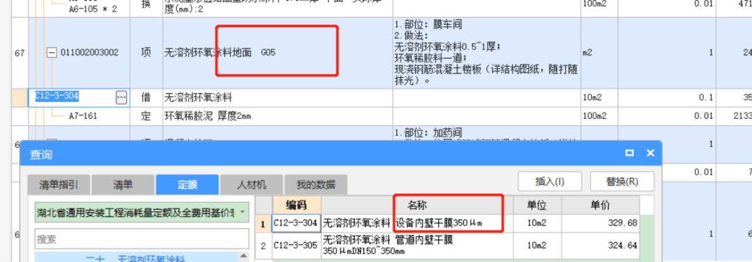很多人喜欢用计价软件里的搜索功能。比如我们要套一个刷涂料的子目,通常会搜索“涂料”去检索定额,然后直接双击运用,这个过程很简单,但是却没有去校验这个双击取得的定额是不是我们需要的,符不符合我们的清单要求。举一个简单的例子,最近刚做的一个项目,有一个环氧涂料的地面,做项目的人员检索出来一个设备内壁使用的环氧涂料定额就直接放进来的,结果如下图所示,这个定额和清单要求完全不符。