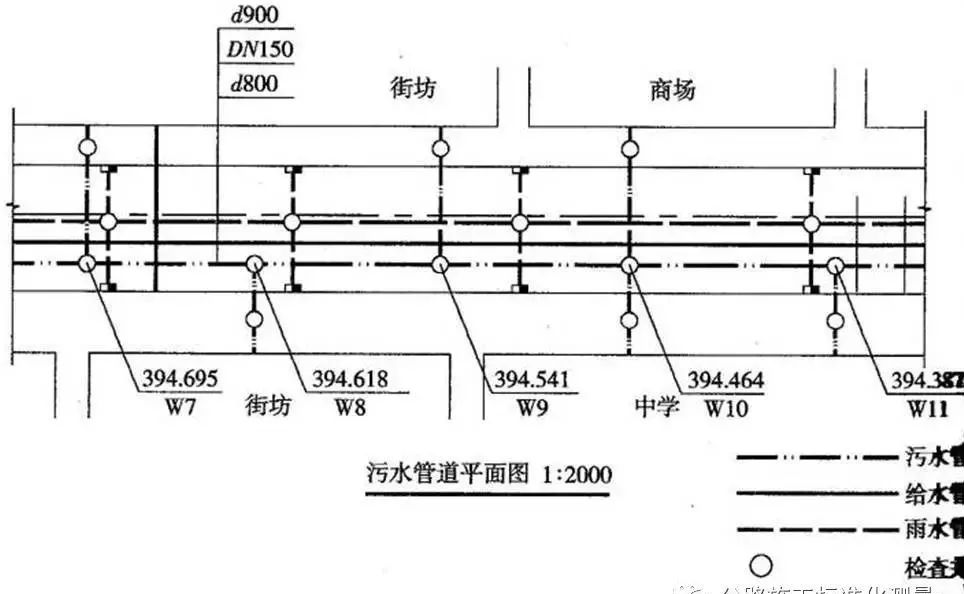 表明管道的平面位置,管道直径、长度、坡度,检查井位置、编号,水流方向等。