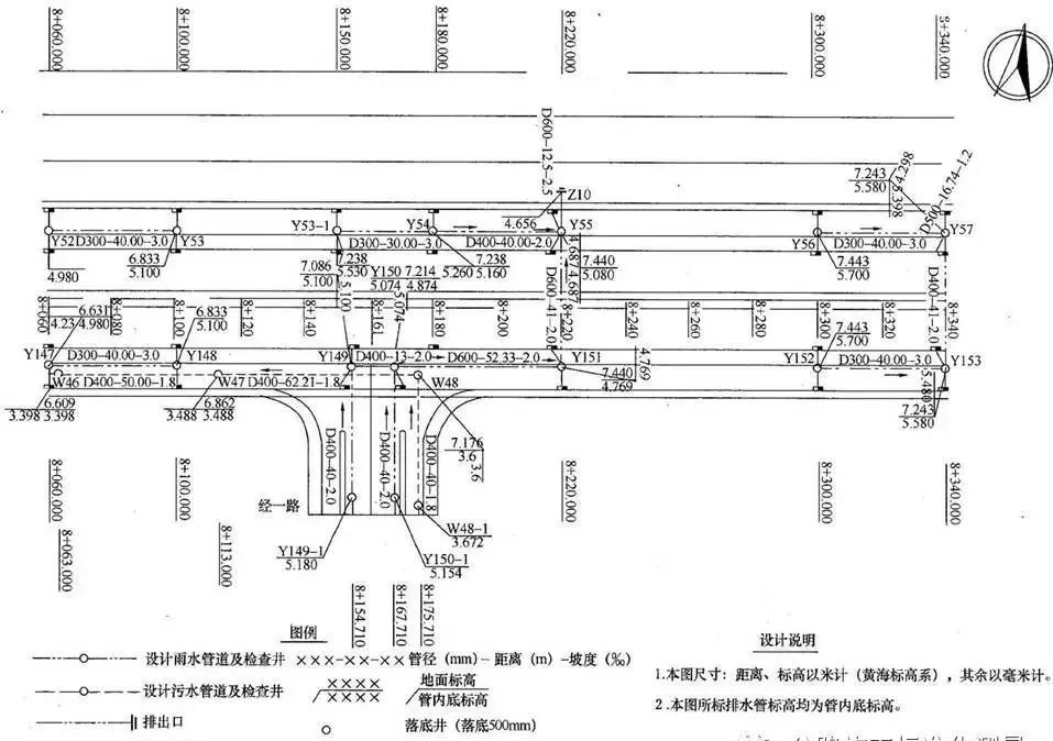 支管标注:SYD400—方位、代号、管径。即表示由南向接入的直径400mm的雨水管道。