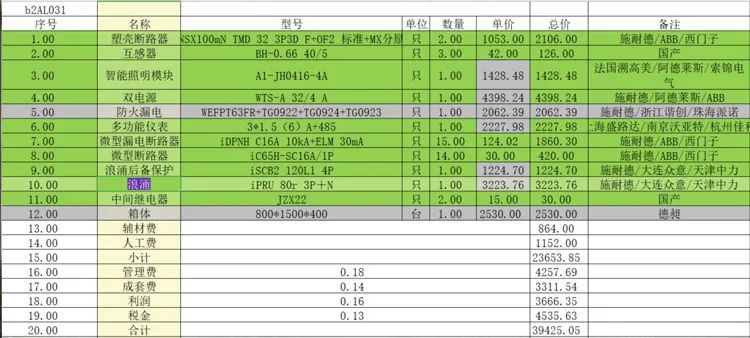 通过以上配电箱元器件的拆解,就可以得出配电箱内主要元器件的大概类型,再根据系统图中的数量及各厂家供应价格,以及一些常用的取费,便能得出一台配电箱的大概费用,配电箱价格体系包括:箱体价格+各元器件价格+辅料+成套安装人工费+管理费+利润+税金等,如下图: