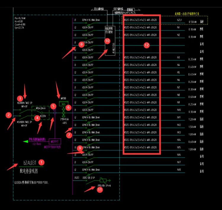 (2)配电箱进线,此处图纸未标注进线电缆信息,可在上一级配电箱出线处查明;