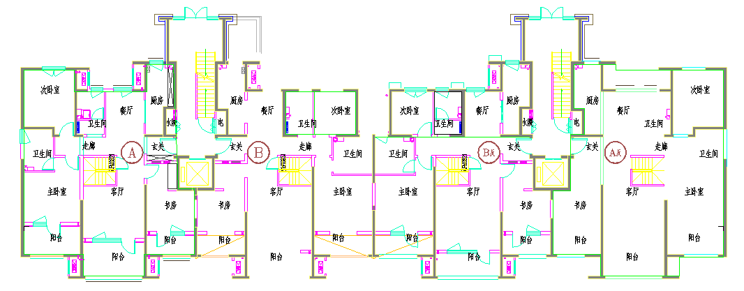 本工程首层分东西两个单元,东单元东西两户为A-反、B-反户型,东单元东西两户为A、B户型: