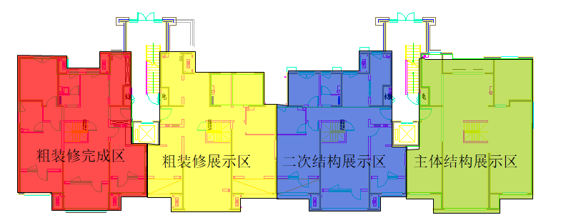 根据首层户型特点以及工程阶段特点,样板展示区划分为四大区域: