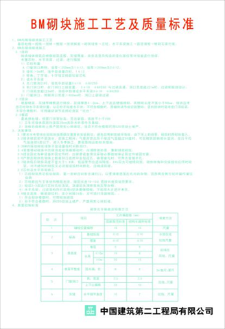采用KT板制作,尺寸600mm*900mm,内容包括穿墙螺栓封堵工艺、BM砌块施工工艺、钢筋植筋工艺、卫生间防水工艺、地暖施工工艺、外窗施工节点、BM砌块芯柱及过梁节点、地面施工节点示意图等。