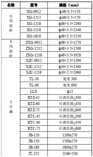 其由立杆、横杆、斜杆、可调托撑等组拼而成,各构配件模数如表。