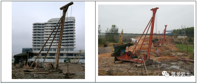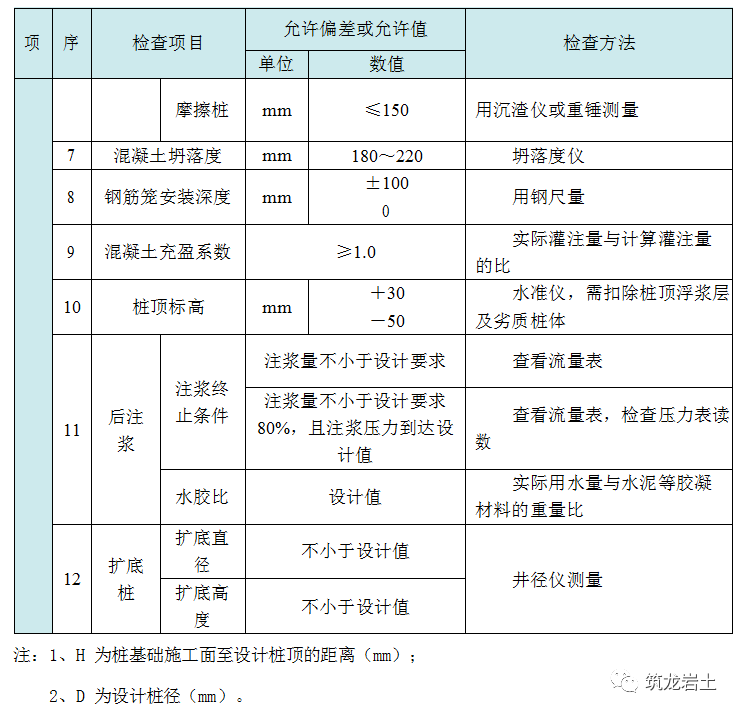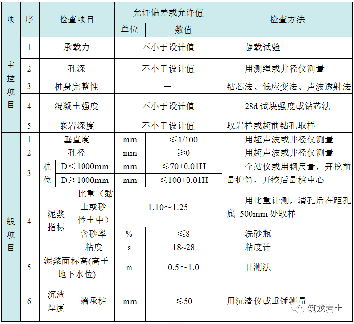 为确定钢筋笼顶标高,并保证钢筋笼的垂直放置,预先焊接两根等长度对称布置的吊筋,吊筋一般伸出孔口,作为判断钢筋笼上浮或下沉的依据。1)应先收紧内套钢丝绳将锥提起,检查锥的中心位置是否与护筒中心一致,检查锥架、底腿是否牢固,检查卷扬机和自动挂脱之间动作是否灵活、可靠。2)应根据冲岩土的松散度选择合适的冲程:冲松散层宜选小冲程(0.5-1.0m);冲砂卵石宜选中等冲程(1-2m);当砂卵石较密实时可加大冲程(2-3m);在基岩中冲击钻进时,宜采用高冲程(2.5-3.5m)。3)冲孔时应及时将孔内残渣排出,每冲击 1~2m,应排渣一次,同时检查成孔的垂直度,如发生斜孔、塌孔或护筒周围冒浆时,应停机,待采取相应措施后再进行施工,相邻桩机不宜过近,以免互相干扰,在刚灌注完毕混凝土的桩旁进行另一根桩成孔施工时,其安全距离应大于 4D(D 为桩直径),或最少时间间隔不应少 36 小时,以防止坍孔。每次捞渣后,应及时向孔内补充泥浆或黏土, 保持孔内水位高于地下水位 1.5-2.0m。应根据不同的钻孔方法、施工设备、设计要求及地层条件,来合理选用清孔方法。a.抽浆法清孔:抽浆法清孔较彻底,且清孔速度快,可适用于各类土层、各种钻孔方法的摩擦桩或支承桩,但在孔壁易坍塌的桩孔中应谨慎使用,以防坍孔。b.换浆法清孔:对以粘性土及细颗粒砂性土层为主的桩孔可采用换浆法清孔。采用该法清孔不易引起坍孔,但清孔速度慢,须控制好泥浆指标及清孔时间, 否则清孔效果难以保证。c.掏渣法清孔:对于冲击、冲抓、旋挖钻进的桩孔,应先采用掏渣法进行初步清孔,待较大颗粒沉渣清理完毕后,可换用换浆法进一步清孔,同时降低孔内泥浆密度。d.喷射法清孔:在导管等混凝土灌注设备已安装,实测孔底沉渣厚度超出规定或设计要求,但超出范围不大,进行二次清孔费时费力,且影响孔壁稳定的情况下,可采用喷射清孔法进行处理,并立即灌注水下混凝土。该法仅宜作为其他方法清孔的辅助手段。清孔持续时间应根据具体清孔方式、地质情况及孔底排出的泥浆指标确定, 抽浆法清孔的速度较快(一般不少于 10min 即可),换浆法清孔速度较慢(30min 至数小时不等),无论采用何种清孔方式,均应确保清孔持续时间,否则难以达到清孔效果。a.清孔过程泥浆指标清孔过程中泥浆密度一般应比钻孔泥浆密度小,但泥浆密度及粘度过小,影响孔壁稳定;采用正循环清孔时,泥浆密度及粘度过小,还会影响泥浆悬浮钻渣的能力,降低清孔效果。在粘性土、粉土及粉砂土为主的土层中,清孔过程中输入泥浆指标宜控制为:相对密度 1.05~1.10;粘度 16~20Pa·s;含砂率<4%。b.终止清孔泥浆指标终止清孔前应在孔底取泥浆进行性能指标检测,终止清孔泥浆指标一般控制在以下范围:相对密度 1.03~1.15;粘度 17~20Pa·s;含砂率<4%;胶体率>98%。4)缩短施工历时在确保清孔效果的同时,应加强工序衔接,提高工作效率,尽量缩短清孔至混凝土灌注之间的的时间间隔。5)进行首批混凝土灌注前,再次探测泥浆指标及孔底沉渣层厚度,如超过规定要求时,立即进行再次清孔,直至符合要求时方可灌注水下混凝土。根据建筑工程《地基基础工程施工质量验收规范》(GB 50202-2018),混凝土灌注桩的质量检验标准应符合表中的规定。