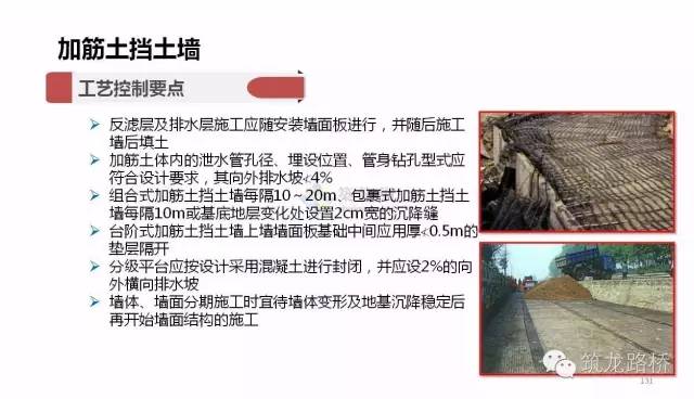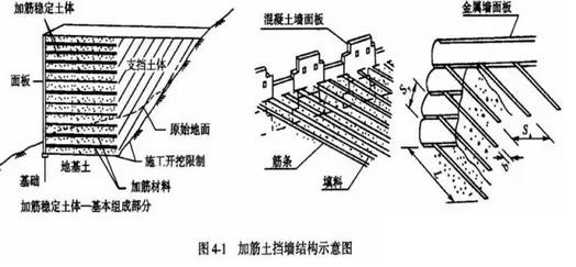 加筋土挡土墙:是在土中加入拉筋,利用拉筋与土之间的摩擦作用,改善土体的变形条件和提高土体的工程特性,从而达到稳定土体的目的。由面板、拉筋组成,依靠填土、拉筋之间的摩擦力使填土与拉筋结合成一个整体。