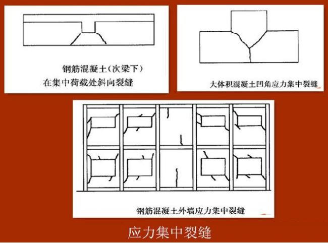 一般多在主体结构建成后出现,混凝土结构应力集中裂缝主要分布在门窗洞口、平面或立面突出凹进以及开结构洞口和结构刚度突变及集中荷载等处。对于预应力钢筋混凝土结构,一般在张拉钢筋锚固端产生的局部压应力集中处产生裂缝。