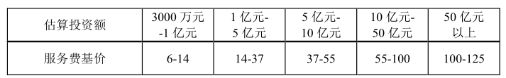 服务费基价根据估算投资额在相对应的区间内用插入法计算,如下表所示:(单位:万元)注:①表中数字下限为不含,上限为包含;②估算投资额为项目建议书或可行性研究报告中的估算投资额;