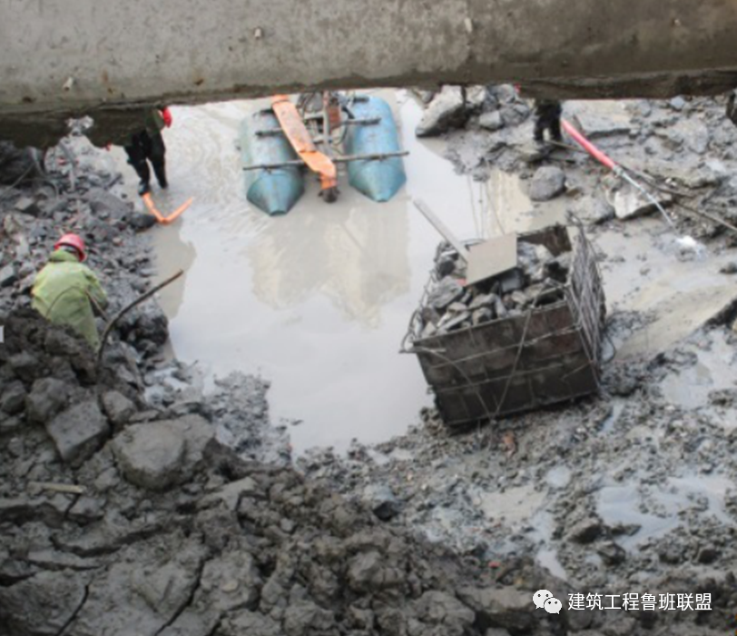 每台浮筒泥浆泵配置两个高压水枪,两名施工人员进行施工;先冲挖环撑下方土方,冲挖完成后冲挖环撑外土方;土方被高压水柱打碎混合为泥浆后由泥浆泵抽取。