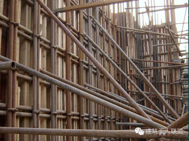普通高度墙体(4.5m以下)加固体系一般由模板、方木、水平方向钢管加固杆、山形卡、丝帽等组成,其模板侧压力传递顺序如下:模板→方木→水平方向加固钢管→山形卡→对拉螺栓。