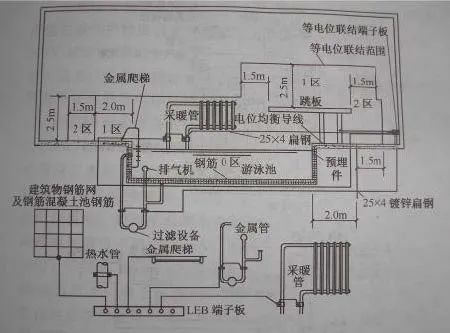 游泳池局部等电位联结(如示意图):在游泳池地面下无钢筋时,应在游泳池周围敷设电位均衡导线,间距约600㎜,并最少在两处作横向连接,且与等电位联结端子板连接。如果地面下敷有采暖管线,电位均衡导线应位于采暖管上方。电位均衡导线可采用25㎜x4㎜的镀锌扁钢或φ10㎜圆钢,或网格为150 ㎜x150㎜,φ3㎜的铁丝网,相连的铁丝网之间相互焊接。其他所有的金属配件,除采用总等电位联结外,应进行局部等电位联结。