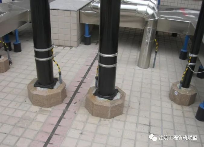 等电位联结线与水泵、空调机组等设备基础的连接(如示意图):当设备与基组为组合式时,设备与机组用螺栓有效固定,并利用接地线(编织铜带或铜芯软线)将水泵、空调机组等设备基础所配的螺栓与等电位引出端连接。