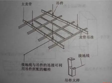等电位联结线与金属吊顶主龙骨的连接(如示意图):(当设计有要求时)可利用4㎜²接地线与吊件所配的螺栓压接连接。