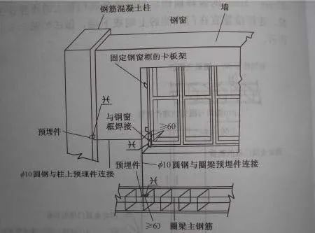 等电位联结线与金属窗的连接(如示意图):采用25㎜x4㎜的镀锌扁钢或φ10的圆钢,一端与圈梁预埋件焊接牢固,另一端与固定金属窗框的金属板焊接,也可通过搭接板(100㎜x30㎜x3㎜的镀锌扁钢)与固定门框上的预埋铁板连接,连接点不少于两处。