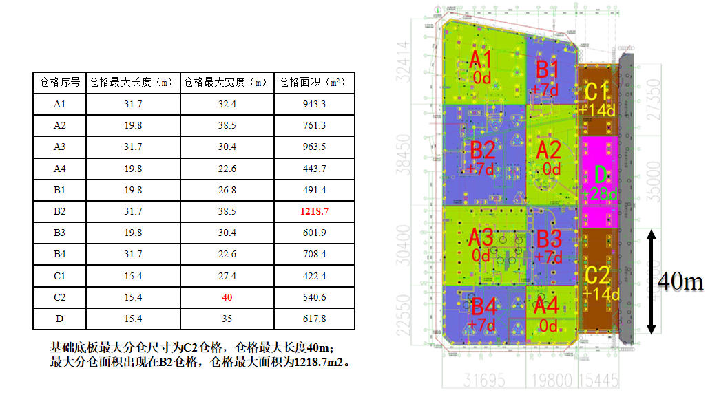 本工程对基础底板、地下四层顶板、地下三层顶板、地下二层顶板、地下一层顶板、地下四层竖向构件、地下三层竖向构件、地下二层竖向构件及地下一层竖向构件 9 个位置分别进行跳仓方案设计,明确了每一部分的仓格划分形式、施工缝留设位置并根据施工分区确定施工顺序。