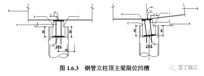 根据设计图纸,在已开挖出的钢管立柱上进行钢管顶标高引测,标高点应醒目,每根钢管立柱上应有对称的 2 点。超长部分钢管立柱宜采用气焊切除,同时根据设计图纸中主梁的尺寸放样于钢管立柱上,后再立柱上进行主梁位置切割成型凹槽及加强板焊接。常见的凹槽尺寸及加强板设计图见下图。