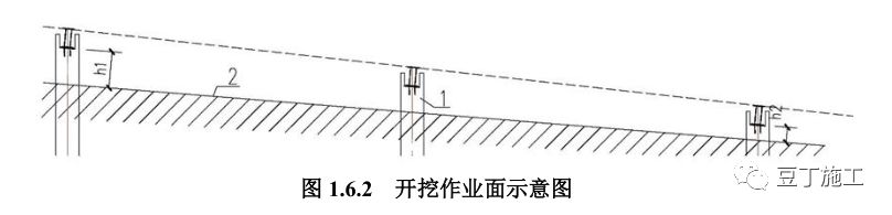 (1- 立柱;2- 挖土面;h1- 挖土面至柱顶最大高度,一般不大于 2m ;h2- 挖土面至柱顶最小高度,一般不小于 50cm) )