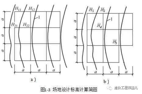 式中,H1、H2、H3、H4分别为一个方格、两个方格、三个方格、四个方格共用角点的标高(m),如图1-3b所示。
