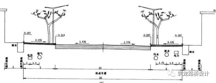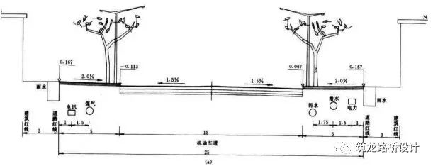 路侧带是位于城市道路行车道两侧的人行道、种植带、公用设施带等的统称。一般高于行车道0.08~0.2m,横坡采用直线型,向内侧倾斜,坡度为1~2%。