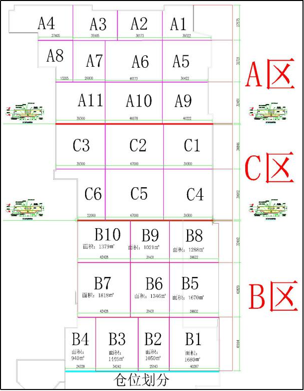 仓位划分:地下室结构平面尺寸140m×309m,地下一层二层计划分成A/B/C 3个大区,A区分为11块,B区分为10块,C区分为6块,块与块之间设置临时施工缝,留设位置主要是考虑到承台位置、单块浇筑混凝土底板面积、土方开挖进度、支撑分段拆除等因素相结合,地下一层二层区段划分见下图:
