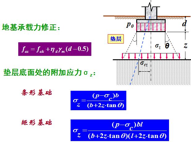 垫层法是将基础底面下一定范围内的软弱土层挖去,然后分层填入强度较大的砂、碎石、素土、灰土以及其它性能稳定和无侵蚀性的材料,并夯实(或振实)至要求的密实度。1.按垫层材料分类:砂垫层、碎石垫层、素土垫层、灰土垫层、粉煤灰垫层、加筋土垫层等。2.按垫层所起作用分类:换土垫层、排水垫层、加筋土垫层。垫层法适用条件:适用于淤泥、淤泥质土、湿陷性黄土、素填土、杂填土地基及暗沟、暗塘等的浅层处理,且建筑物荷载不太大的地基。换填法的处理深度通常宜控制在3m以内较为经济合理,但不应小于0.5m。 在各类工程中,垫层所起的主要作用有时是不同的,如建筑物基础下的垫层主要是起换土作用;而在路堤和土坝等工程,主要是利用垫层起排水固结作用。 地基中的剪切破坏是从基础底面开始的,并随着基底压力的增大而逐渐向纵深发展。因此,若以强度较大的砂或其它填筑材料代替软弱土层,就可提高持力层承载力,从而避免地基破坏。基础下地基浅层部分的应力较大,其沉降量一般在地基总沉降中所占的比例也较大,若以密实的砂或密实填筑材料代替浅层软弱土,就可减少地基的大部分沉降量。另外,由于密实垫层对应力的扩散作用,使作用在下卧土层上的压力较小,因此也相应减少了下卧土层的沉降量。由于砂或碎石等垫层材料的透水性大,当软弱土层受压后,垫层可作为良好的排水面,使基础下面的孔隙水压力得以迅速消散,加速垫层下软弱土层的固结,从而提高地基土强度。由于粗颗粒垫层材料的孔隙较大,不易产生毛细管现象,因此可以防止寒冷地区土中结冰所造成的冻胀。排水垫层是指软土地基上堤坝或大面积堆载基底等所铺设的水平排水层,一般采用透水性良好的中粗砂或碎石填筑,必要时在垫层底和上表面增设具有反滤性能的土工合成材料,防止砂石垫层被淤堵和拉裂。 (1)作为水平排水层和下卧软土层的排水通道,加速地基的排水固结,提高浅层地基的抗剪强度,配合砂井,加固深部软土层; (2)约束软弱下卧层的侧向变形,提高地基的稳定性,并改善其变形性质。加筋土垫层是指由砂、石和素土垫层中增设各种类型加筋材料组成的复合垫层。如加筋土垫层、土工格室垫层等。 (2)增强砂石垫层的整体性和刚度,减小不均匀沉降;主要内容:垫层材料的选用、厚度的确定、垫层铺设范围以及地基沉降计算等。 垫层材料:砂、碎石、素土、灰土、粉煤灰、矿渣、加筋土等。对于碎石、卵石、砂夹石、砂和矿渣等粗粒换填材料的垫层由于在施工期间垫层自身的压缩变形已基本完成,且量值很小,因而在地基变形计算中,可以忽略该部分;但对于细粒材料,尤其是厚度较大的换填垫层,则应计入垫层自身的变形。s1计算中,应力可取垫层顶面和底面压力的平均值。一般砂垫层Es=20~30MPa;粉煤灰则Es=8~20MPa,碎石、卵石为30~50MPa。无论是地基还是垫层,其沉降计算均可传统分层总和法计算。 (1)对非自重湿陷性黄土地基上的垫层厚度应保证天然黄土层所受的压力小于其湿陷起始压力值。 (2)对自重湿陷性黄土地基上,垫层厚度应大于非自重湿陷性黄土地基上垫层的厚度,或控制剩余湿陷量不大于20cm才能取得好的效果。按照处理范围素土垫层或灰土垫层可分为局部垫层和整片垫层。 (1)局部垫层:一般设置在矩形(或方形)基础或条形基础底面下,其平面处理范围,每边超出基础底面的宽度不应小于垫层厚度的一半。(2)整片垫层:一般设置在整个建筑物(跨度大的工业厂房除外)的平面范围内。每边超出建筑物墙基础外缘的宽度不应小于垫层的厚度,并不得小于2m。粉煤灰和天然土中的化学成分具有很大的相似性,具有火山灰的特性,在潮湿条件下具有凝硬性,与二氧化硅,三氧化二铝等物质进行水化反应,生成水化产物,使碾压密实的粉煤灰颗粒胶结固化形成块状结构,可提高粉煤灰的强度,降低压缩变形,增强抗渗性和水稳定性。粉煤灰的压实曲线与粘性土相似,具有相对较宽的最优含水量区间,其干密度对含水量的敏感性比粘性土小,最优含水量易于控制。土一般由固体颗粒、水、空气组成。土中固、液、气三相组成的比例反映干湿、密实程度,对评价土的工程性质有重要意义,是垫层压实参数选择的依据。实践证明,要使土的压实效果最好,其含水量一定要适当。对过湿的土进行碾压会出现“橡皮土”,不能增大土的密实度。对很干的土进行碾压,也不能把土充分压实。在干密度——含水量曲线上干密度的峰值即为最大干密度,与之对应的含水量即为最优含水量。(1)当粘性土的含水量较小时,水化膜很薄,以结合水为主,颗粒间引力大,在一定的外部压实功作用下,还不能克服这种引力而使土粒相对移动,压实效果差,土的干密度较小; (2)当增加土的含水量时,结合水膜逐渐增厚,颗粒间引力减弱,土粒在相同的压实功能下易于移动而挤密,压实效果提高,土的干密度也随之提高; (3)当土中含水量增大到一定程度后,孔隙中开始出现自由水,结合水膜的扩大作用并不明显,颗粒间引力很弱,但自由水充填在孔隙中,阻止了土粒间的移动,并随着含水量的继续增大,移动阻力逐渐增大,压实效果反而下降,土的干密度随之减少。机械碾压法是采用压路机、推土机、羊足碾、振动碾或其它压实机械来压实软弱地基土或分层填土垫层。常用于基坑面积宽大和开挖土方量较大的工程。