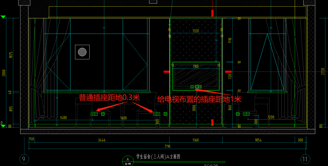 安装专业图纸的图例表或设计说明中,一般会标注末端设备(灯具、插座、喷头、风口等)的安装高度,但如果仅根据图例表判定,很容易出现错误判断,实际工程中,需结合精装修平面图和立面图综合确定。问题1,安装工程图纸的图例表中注明,普通插座示意安装高度均为距地0.3米;而查找精装修的立面图发现,宿舍内安装电视机位置的插座距地高度为1米;问题2,安装工程图纸的图例表中注明,灯具安装高度未标注,则按常规理解为棚顶安装。而查阅精装修图纸,2层包间内吊顶有造型,不同区域高度不同,而且部分房间高度差异较大,灯具、喷头和风口的标高,必须根据精装修吊顶标高及安装位置确定具体设备设施的安装高度,进而进行管线工程量计算;