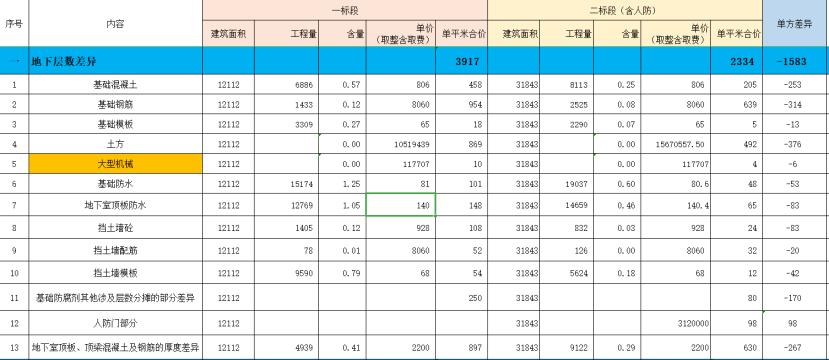 1.一标段与二标段地下层数不一致。二标段为地下两层,一标段为地下一层,层数不同,会导致地基、土方、挡土墙等内容的造价占比不一致,从而形成单方造价差异。