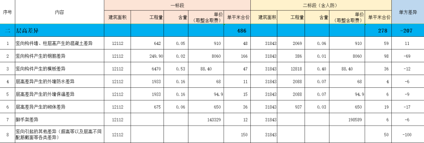 随后进行详细数据分析,包括竖向构件的量差,以及基础及地下室顶板的工程量分摊等,按照造价构成逐项形成差异表进行对比。(下表为部分内容)