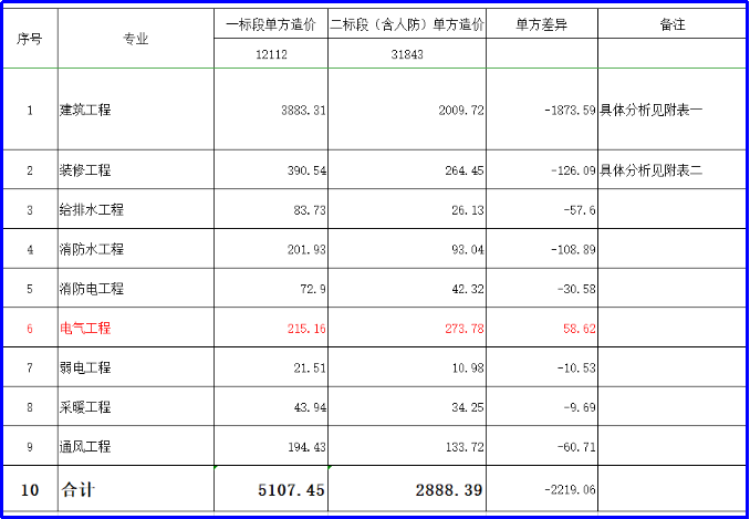 首先,从造价单方指标上分析,两个标段在专业上存在哪些差异。该项目按常规转化了建筑、装饰、电气、给排水、消防、通风等专业,按各专业统计两个标段的单方造价,进行对比分析。该项目专业单方造价差异见下表:
