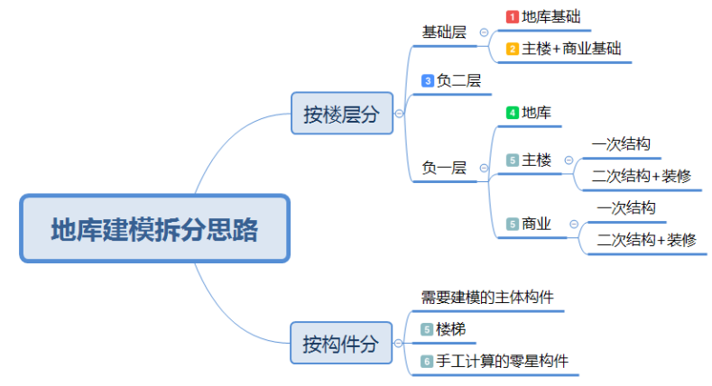 经过分析图纸,项目组最终决定,按楼层、部位、构件三个维度进行拆分。先按楼层将整个地库拆分成基础层、负二层、负一层三个模型,再按部位拆分成地库、主楼、商业三个部分,其中主楼地下工程量需要单独提量;然后按构件拆分成需要建模的主要构件、楼梯及不用建模的零星构件。最终将地库拆分6大块,安排6名算客同步建模,见下图。