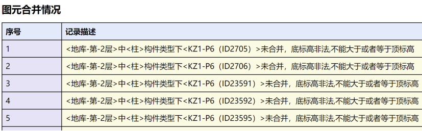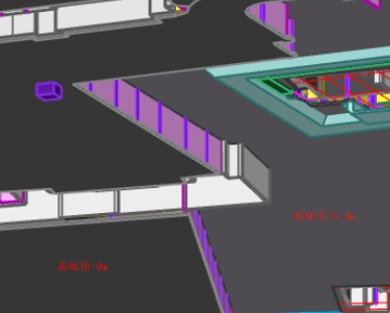 模型合并时我们使用的是“合并工程”,可以一次合并多个单体和楼层,但是合并的过程并不是一帆风顺,也遇到不少麻烦,包括合并后有图元丢失等情况。例如,如下图所示的挡墙两侧基础高差为4.6米,其上的负二柱底标高为基础底标高,合并时找基础出现了问题,导致柱底标高在柱顶标高之上,柱高度非法,丢失了部分柱子。类似的还有墙标高非法,墙无法合并,则其上的洞口、过梁、墙面装修等均无法合并,需要在合并后的模型中补充绘制。项目结束后我们计划进行了项目总结,寻找措施在以后的项目中避免类似情况发生。