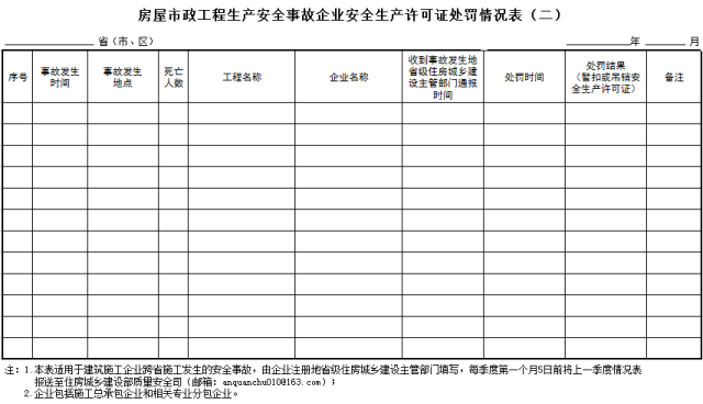 附件:1.房屋市政工程生产安全事故企业安全生产许可证处罚情况表(一)、(二)